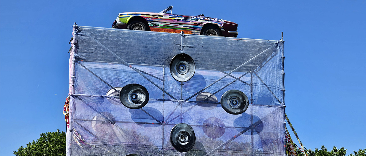 Crédit visuel : Parabolid, Festival Freestyle/La Villette, 2025, voiture vintage, autocollants, échafaudages, filets, paraboles, peinture. OEuvre collective de Ash, Héloïse Sailly, François Toison et Bahar Kocabey avec la collaboration d'Helena Heras © Droits réservés